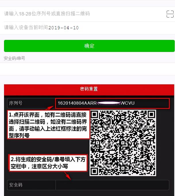 第四步:輸入需要更改海康威視智能攝像機(jī)錄像機(jī)的序列號(hào)或者直接掃描二維碼,自動(dòng)生成安全碼后,輸入主機(jī),即可更改密碼。